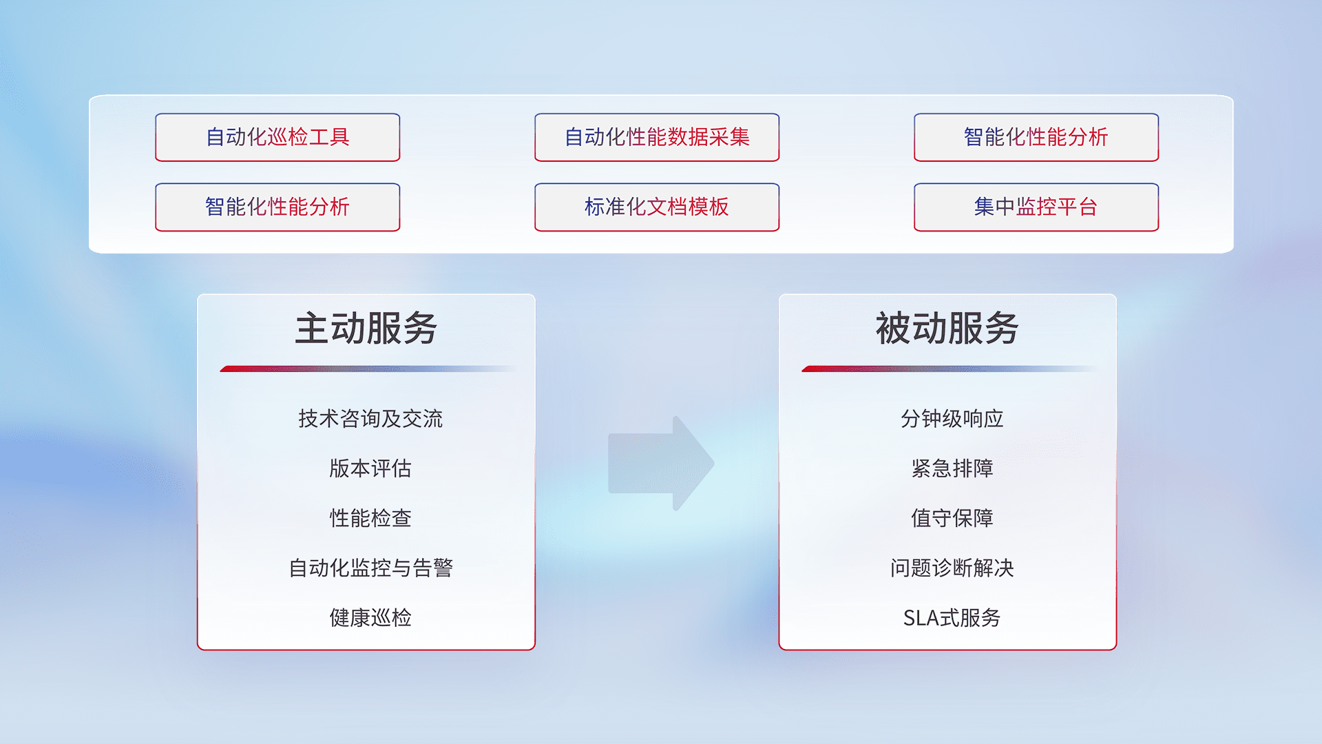 智能化工具和标准化文档,,,,保障服务质量,,提供主动服务(包含技术咨询、、、、版本评估、、、、性能检查、、、自动化监控与告警、、、、健康巡检)和被动服务包含(分钟级响应、、、、紧急排障、、值守保障、、、问题诊断解决、、SLA服务)。。