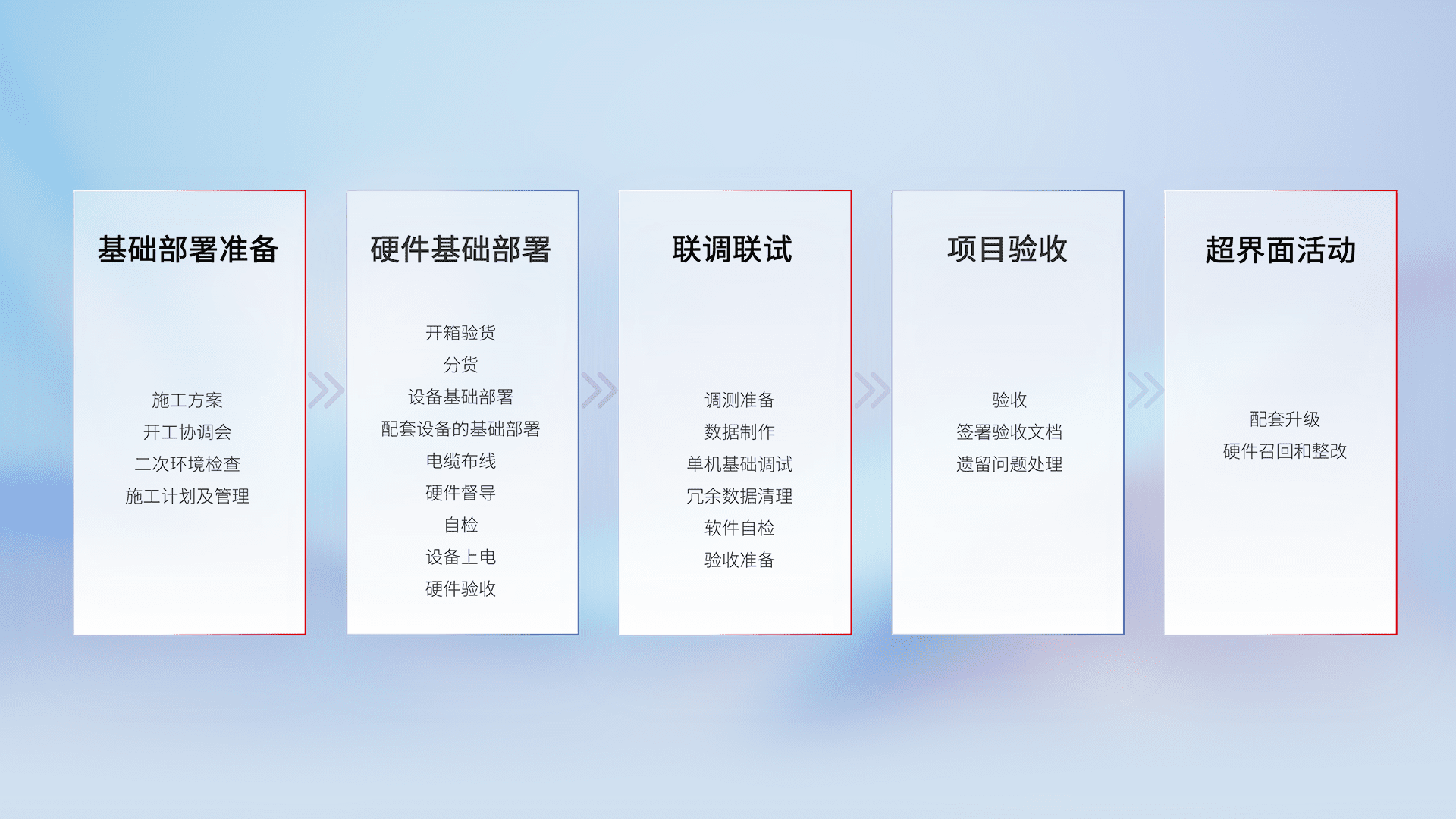从基础部署准备、、、、硬件基础部署、、、、联调联试、、、项目验收、、、、越界面活动的全过程可追溯,,,,保证施工质量和进度。。
